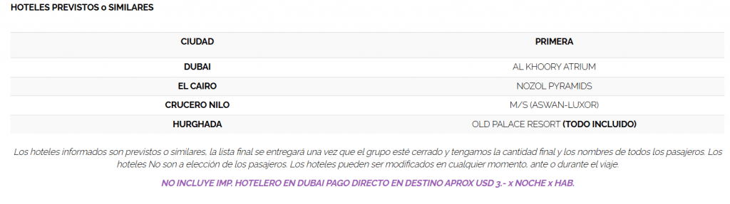 - CONDICIONES SALIDA ESPECIAL EGIPTO & PLAYA CON DUBAI OCTUBRE 2026: En caso de no reunir un mínimo de 10 pasajeros, los precios podrán variar y/o modificarse tanto el itinerario terrestre y/o aéreo por cuestiones operativas. La disponibilidad de plazas está sujeta a 30 espacios. POR DISPOSICION DE LAS LINEAS AÉREAS, LOS BILLETES AÉREOS DE TODO EL GRUPO SE EMITEN JUNTOS ENTRE 60 /45 DIAS ANTES DE LA SALIDA O AL MOMENTO DE COMPLETAR EL CUPO – INDEPENDIENTEMENTE DEL PAGO INDIVIDUAL DE CADA PASAJERO. UNA VEZ EMITIDOS LOS BOLETOS DE CUPO EMIRATES NO PERMITEN CAMBIO DE NOMBRE, DE RUTA NI DE FECHA NI ANTES NI DESPUÉS DE LA SALIDA. NO PERMITEN REEMBOLSO. SIN EXCEPCIONES. LOS BOLETOS DE CUPO EMIRATES NO PERMITEN LA ASIGNACIÓN DE ASIENTOS HASTA EL DIA DEL CHECK IN EN MOSTRADOR DEL AEROPUERTO EL DÍA DEL EMBARQUE, ESTE TRAMITE QUEDA EXCLUSIVAMENTE EN MANOS DE LA LINEA AÉREA. Las condiciones de uso y cambios de los boletos aéreos se rigen inexorablemente bajo las normas del Contrato de Transporte Aéreo y especialmente las condiciones establecidas por las líneas aéreas en la base tarifaria adquirida por el pasajero.